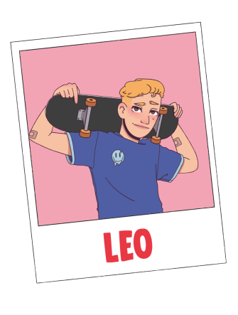 Leo no es tan bajito como Bruno, pero tampoco ha dado el estirón. Es rubio y lleva el pelo cortado a la moda: con el flequillo más largo haciendo como un tupé adelante y con la parte de detrás rapada. Viste pantalones anchos, camisetas holgadas y vistosas y gorra, y siempre llega al insti con su skate, que no guarda hasta entrar en clase. Se ha hecho muy amigo de Bruno y ha entrado a formar parte del grupo de Goa. Últimamente parece que se le están despertando sentimientos hacia ella... ¿Sentirá Goa lo mismo por él?