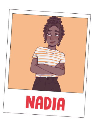 Nadia siempre es la primera de la clase y la más estudiosa. Tiene el pelo extremadamente rizado y lo lleva siempre con trencitas o con recogidos que le hace su madre. Es introvertida y no suele hablar demasiado, pero se siente muy a gusto con Goa y los demás.